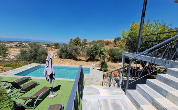 The plot is fenced and beautifully landscaped with various ornamental trees and plants, at the edge of which one finds a swimming pool measuring 4 x 8.20 (and a fixed depth of 1.5 m.) with space for sunbeds. To ensure constant water supply, there are 2 water tanks of 26 cubic meters with pressure pump. In the garden there is a shaded area, a self-contained storage room of 5 sq.m., while the entrance is through a large garage door with an automatic mechanism with an open parking space for 1 car.