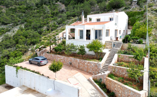 The residence includes four bedrooms and two bathrooms, featuring quality finishes like marble stairs and granite tiles. Outdoors, you’ll find an equipped BBQ area, a landscaped garden with flowering plants and fruit trees, and four parking spaces, including one covered. Additional features include an alarm system, a charming tiled roof, and spacious terraces for outdoor enjoyment. Less than an hour and a half from Athens and just a 10-minute drive from the nearest village, this property blends natural beauty with easy access. Sold furnished and equipped, this home is ready for immediate enjoyment.