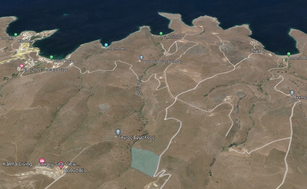 The property measures almost 40.000 m² (39.470sqm.) and It is in approximately 2 km far from Skilos beach and 3 km far from Saint Nicolas beach, two of the best coasts, on the southeast part of Kythnos island. It enjoys panoramic view on the sea, the bays, the rural hills of the area, as well as other islands of Cyclades. This amphitheatrical land plot could accommodate building construction, is already connected to electricity and water supply networks, and is accessible by asphalt road. It is approximately 8 km far for Dryopida and Kanala villages.