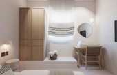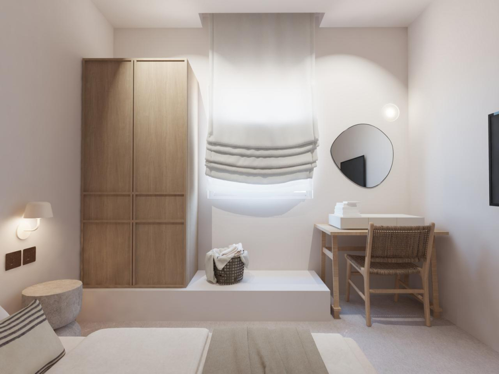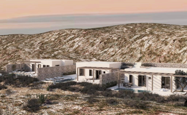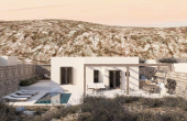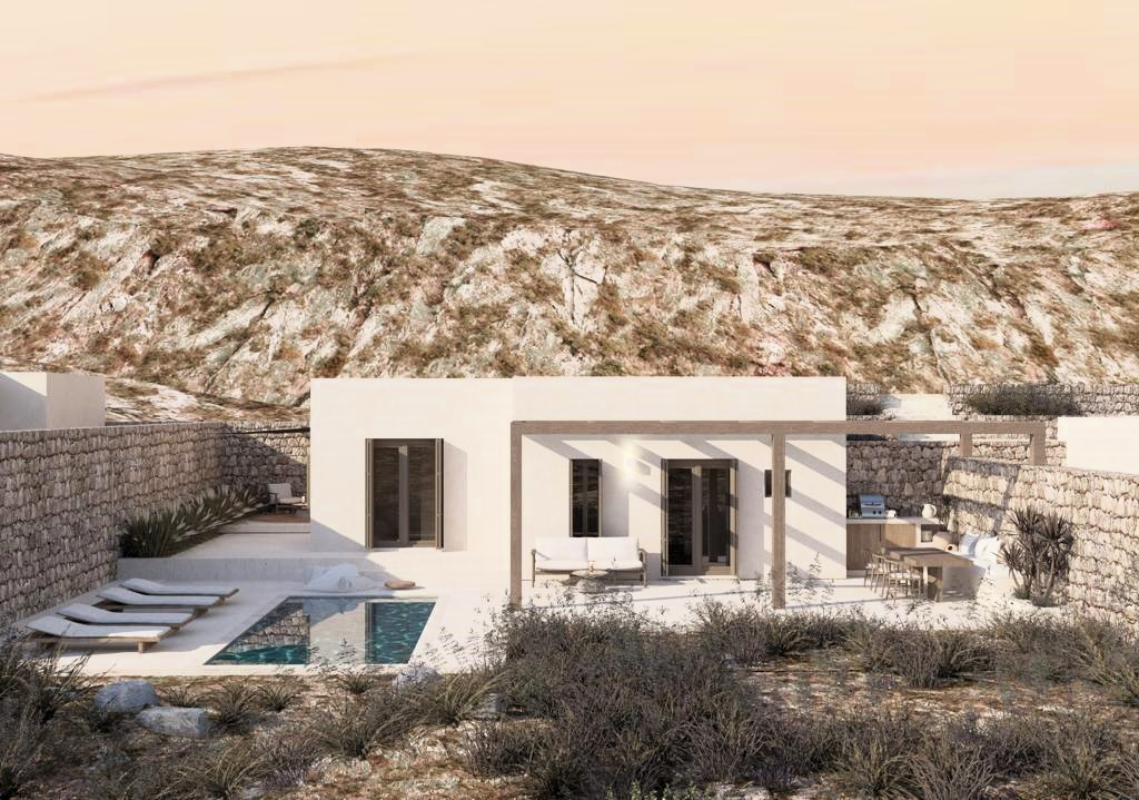 The 67sqm. house features three well-appointed bedrooms, two bathrooms, a private swimming pool, and a dedicated parking space. The standout feature is its outdoor area: a beautifully landscaped garden and a private pool that overlook the glistening Aegean, offering a tranquil oasis to unwind.