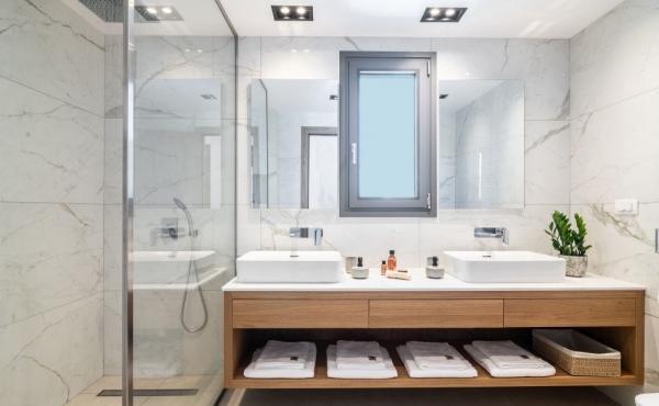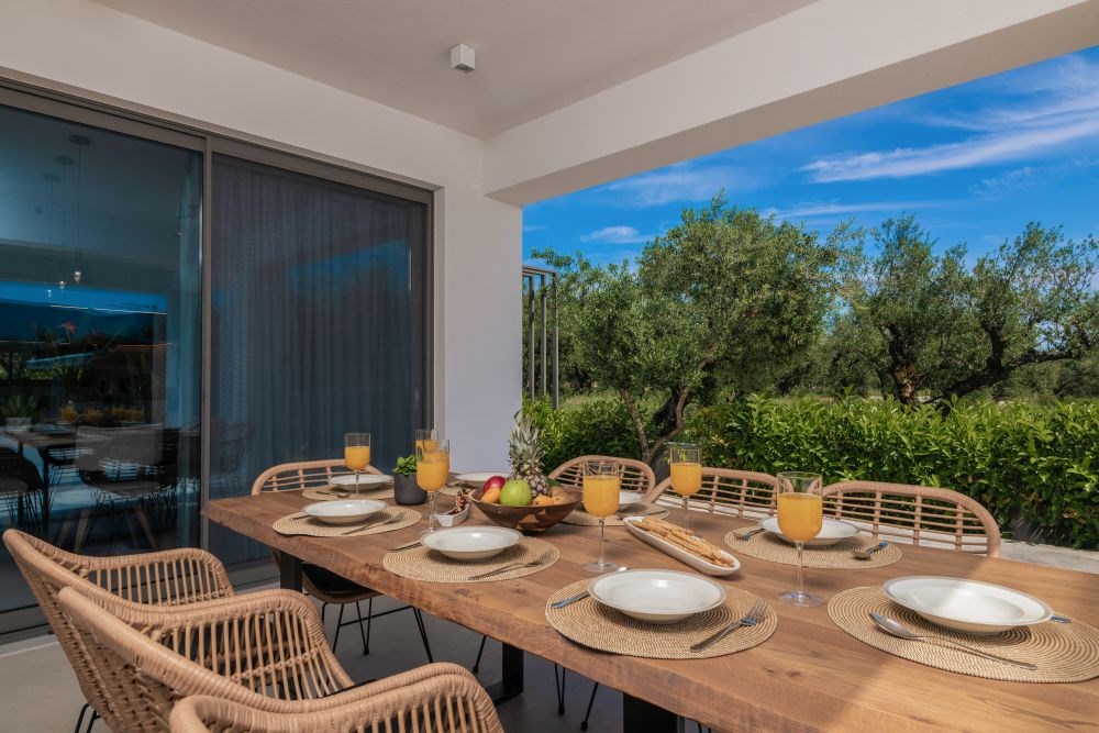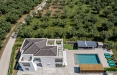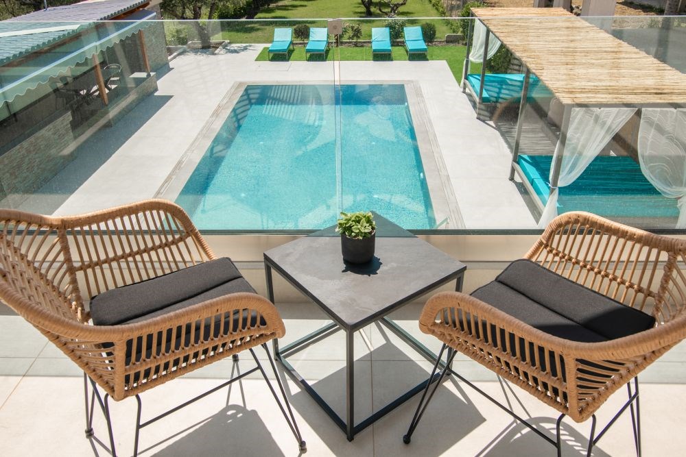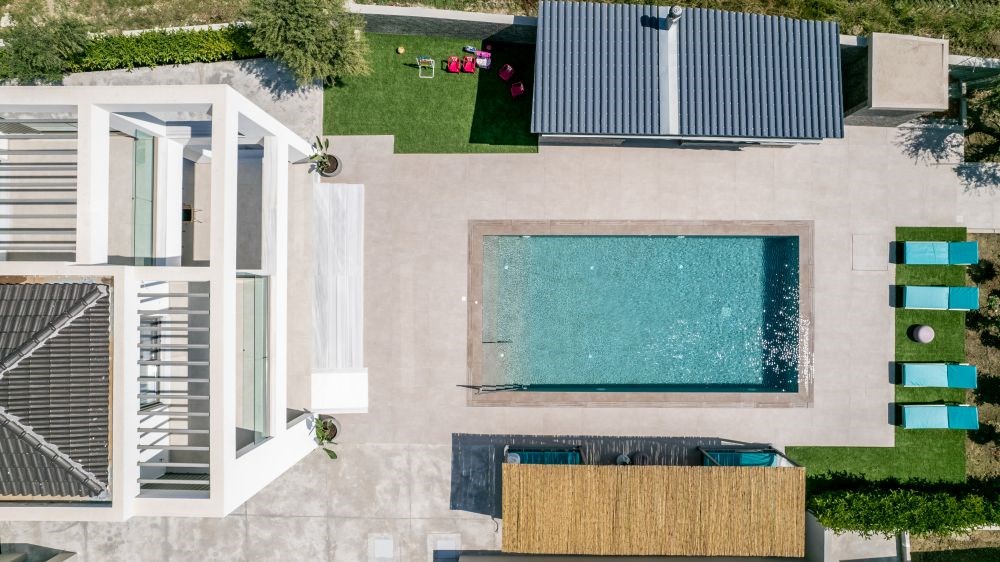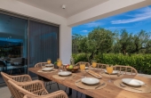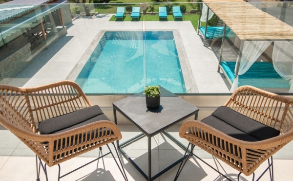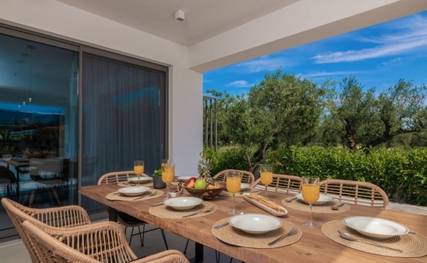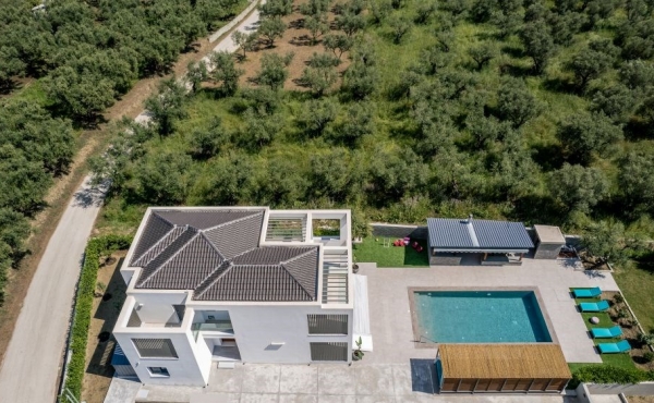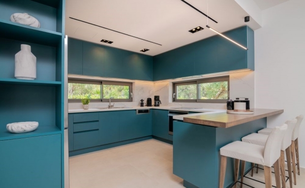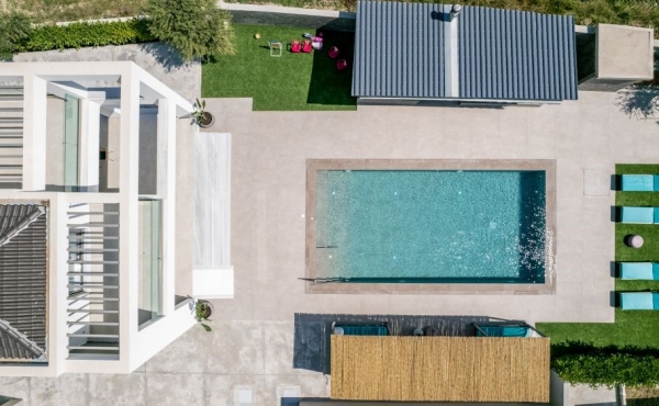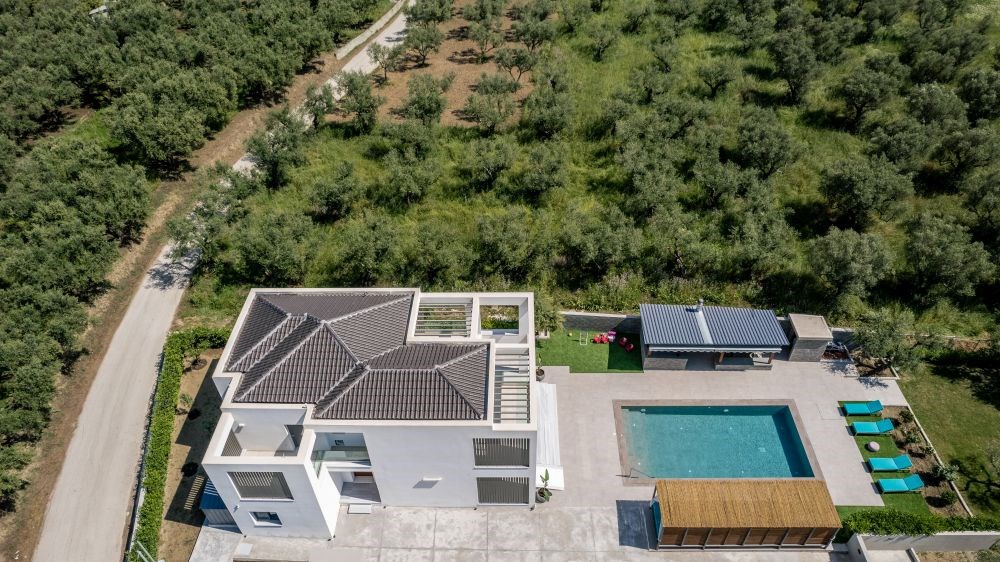The surrounding area of the house is paved with large non-slip concrete tiles and shaped with masonry around the plot adorned with olive grove with productive olive trees and dense green shrubby planting. The main garden is beautifully landscaped with lawn and includes an outdoor pool of 72 sq.m. which has Jacuzzi function and is surrounded by 6 sun loungers and two canopy beds. The outdoor areas also have a built-in bbq with fridge, freezer and sink, as well as a shaded area with an 8-seater granite table to enjoy your meals, an outdoor shower, an outdoor bathroom, and a storage room. The paths and terraces around the villa are completely paved, and therefore clean, so that one can move freely in the outdoor and indoor areas. The entrance is through a sliding electric door and there is an enclosed parking space for 2 cars.