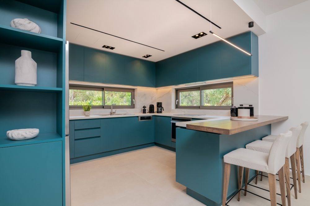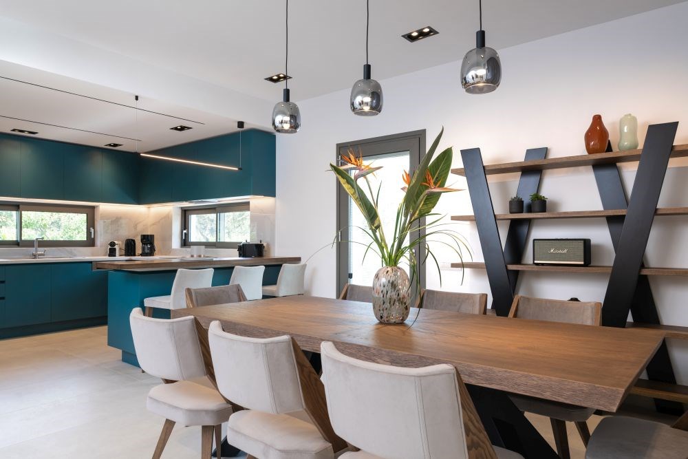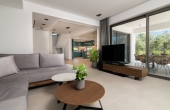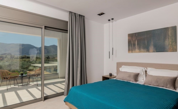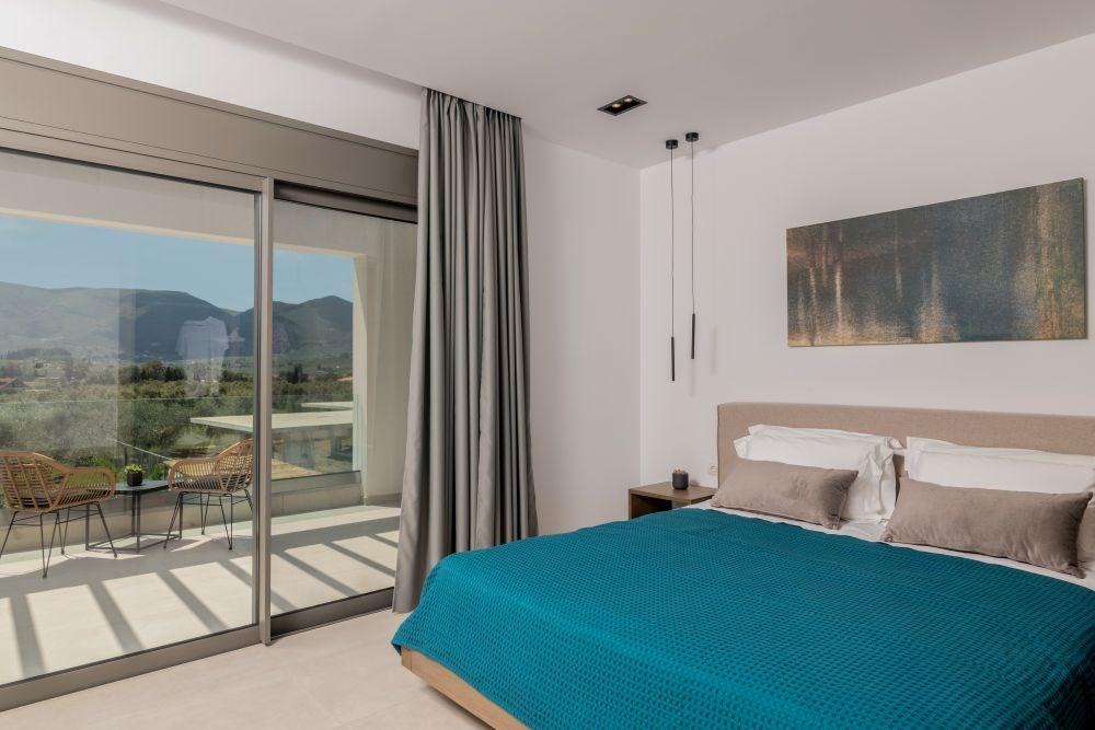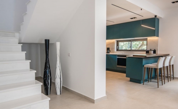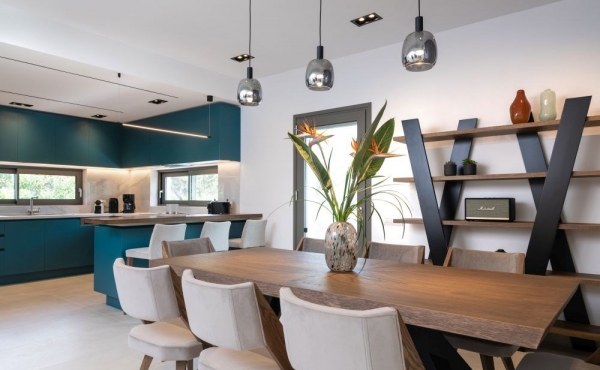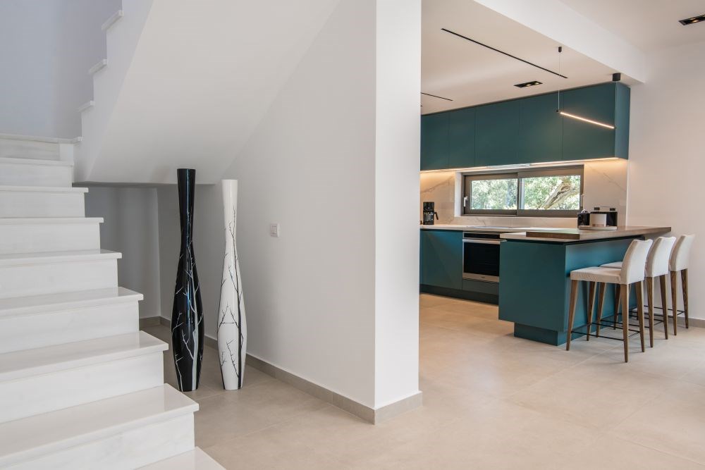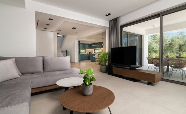 This is a spacious luxury country house oriented, with a total of 4 bedrooms, with modern minimal decoration and furniture. It is designed to fully meet modern residential needs and to offer its owners unique moments of relaxation and tranquility due to the large designed opening glass fronts with thin aluminum profiles with panoramic views of a beautifully designed garden in a green environment.