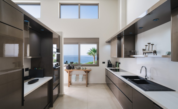 The residence is surrounded by big garden areas, large covered terraces with excellent views to the sea and direct access to the saltwater heated pool. Entering this fully fenced property you will see a covered parking area with 2 car slots and a small lovely garden ideal to grow local vegetables and experience the cretan products taste.