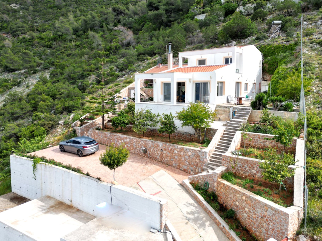 The residence includes four bedrooms and two bathrooms, featuring quality finishes like marble stairs and granite tiles. Outdoors, you’ll find an equipped BBQ area, a landscaped garden with flowering plants and fruit trees, and four parking spaces, including one covered. Additional features include an alarm system, a charming tiled roof, and spacious terraces for outdoor enjoyment. Less than an hour and a half from Athens and just a 10-minute drive from the nearest village, this property blends natural beauty with easy access. Sold furnished and equipped, this home is ready for immediate enjoyment.