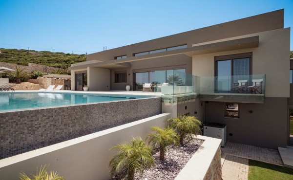 The residence is surrounded by big garden areas, large covered terraces with excellent views to the sea and direct access to the saltwater heated pool. Entering this fully fenced property you will see a covered parking area with 2 car slots and a small lovely garden ideal to grow local vegetables and experience the cretan products taste.